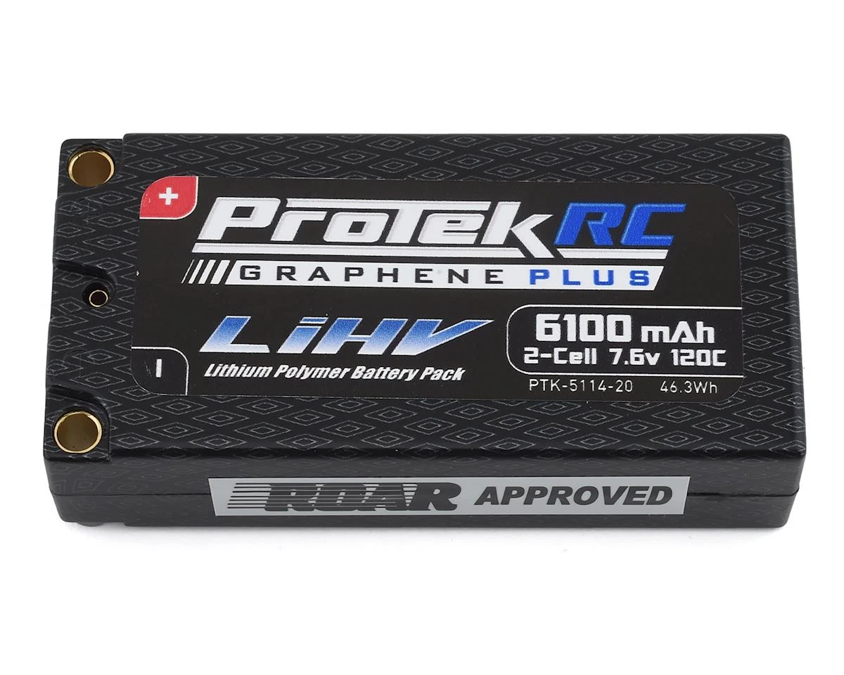 The ProTek R/C 2S 120C Graphene + HV 6100mAh Shorty LiPo Battery is a great battery option for any racer looking for a lightweight, shorty style battery. Weighing 217 grams, the HV Shorty is lighter than a standard shorty pack, with a massive increase in capacity. This makes it an ideal pack for 2WD and 4WD modified racing, or stock class racers that want optimum voltage for the entire run. This pack is also a great choice for 1/8 e-buggies that want to run a lightweight 2x2S saddle pack configuration.