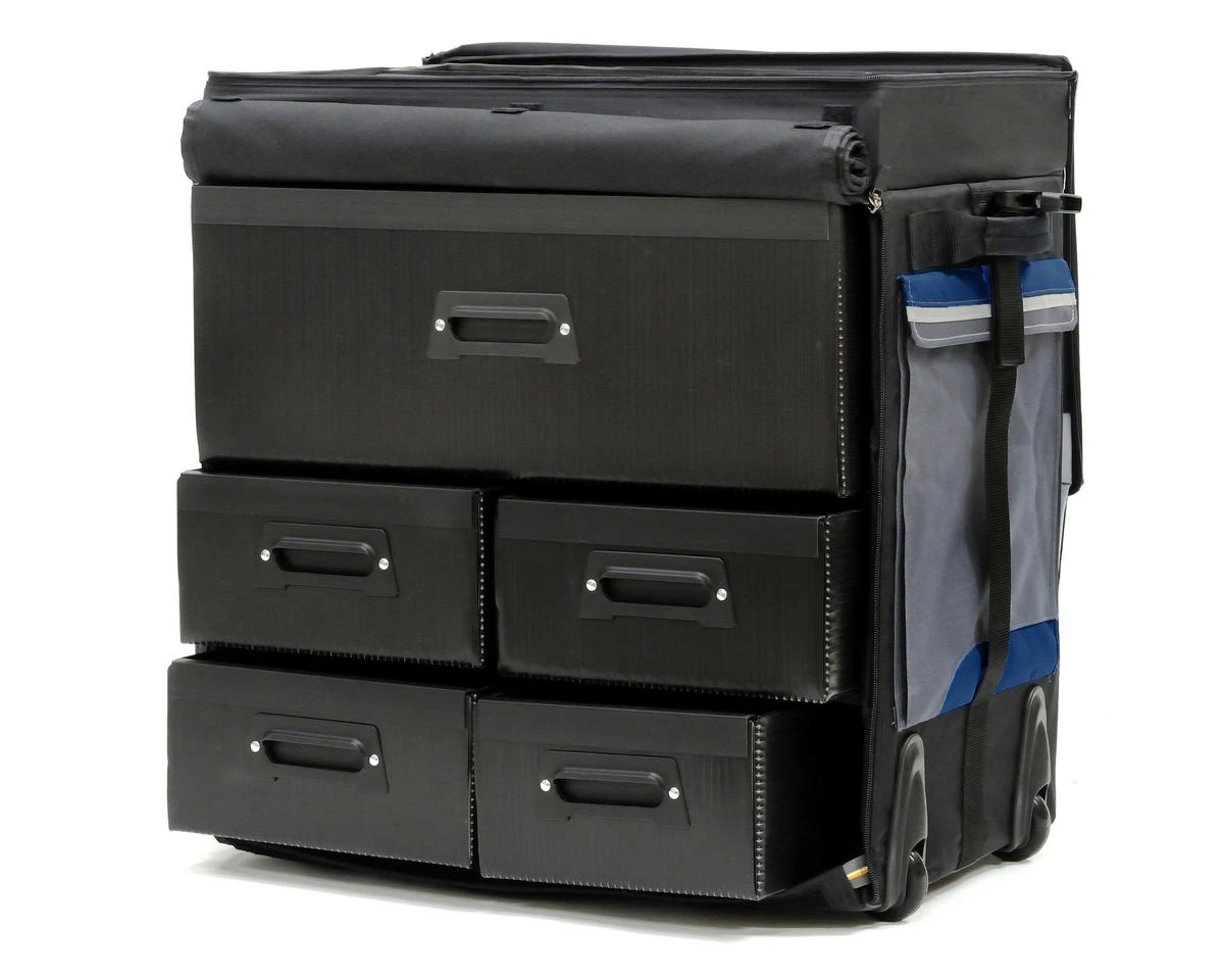 Inside the bag has three layers of drawers, with four split draws on the bottom (two each side by side above each other) and one large drawer on the top. These are the newer style Hauler Bags that have plastic inner boxes. The large drawer on the top is large enough to hold a 1/8th scale buggy with wing and wheels attached!