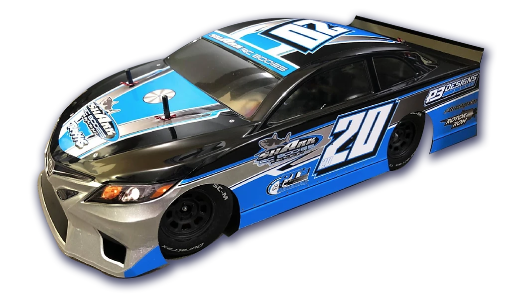 When Shark created the Zero they wanted to have a car with the best turn in possible and with the detailed nose and hood, this was going to be the best body for turn in. With the shorter deck it will free up the rear of the car too. Making this body great on tacky clay. The design is based off dirt oval streetstocks where the nose, hood and roof remain stock appearing, but the sides are flat like a sheetmetal door. The body is made out of .060 which is thicker and should help the body last longer than other manufactures with thinner lexan.